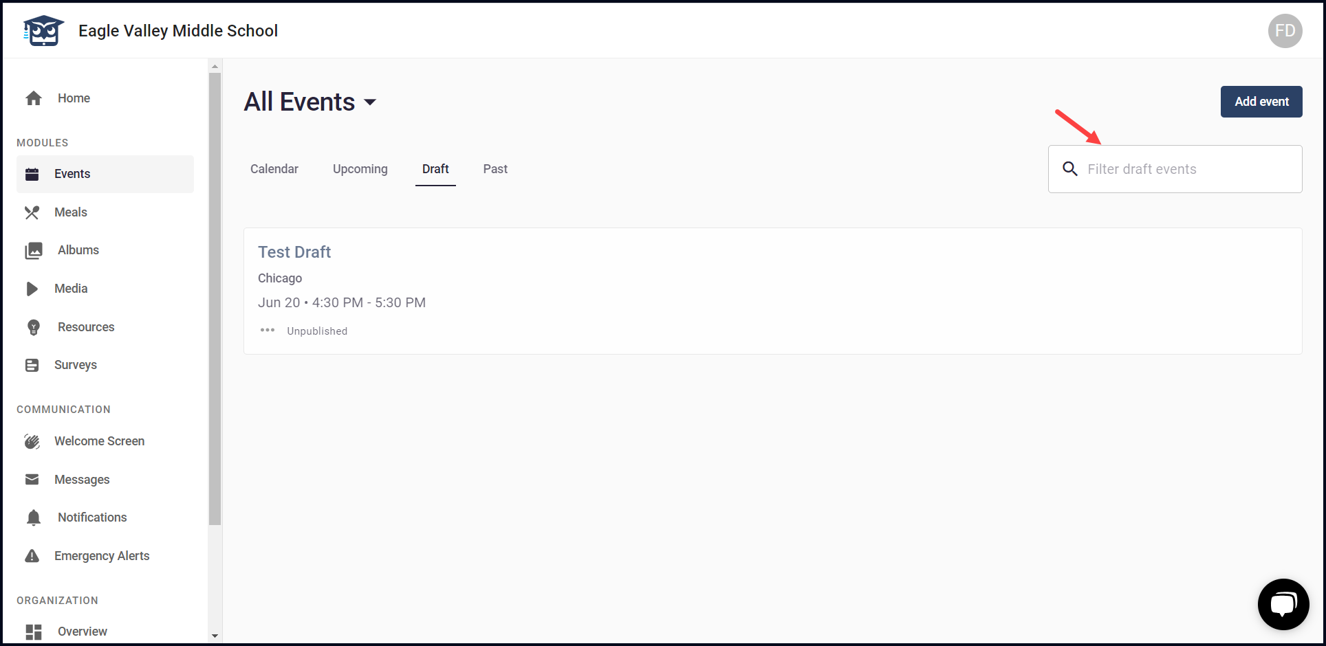 3. To search for a specific event, type the name of the event in the Filter draft events field.