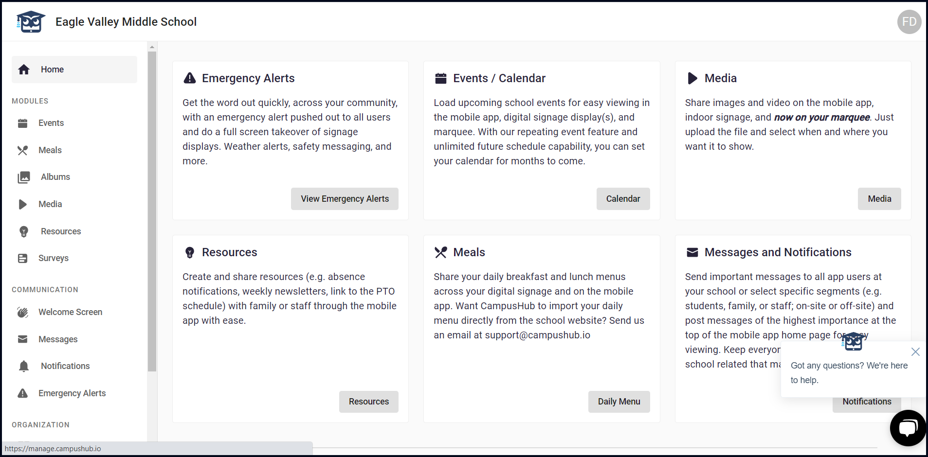 3. Here, an overview of the key features is displayed via individual cards. They include Emergency Alerts, Events/Calendar, Media, Resources. Meals, and Messages and Notifications.