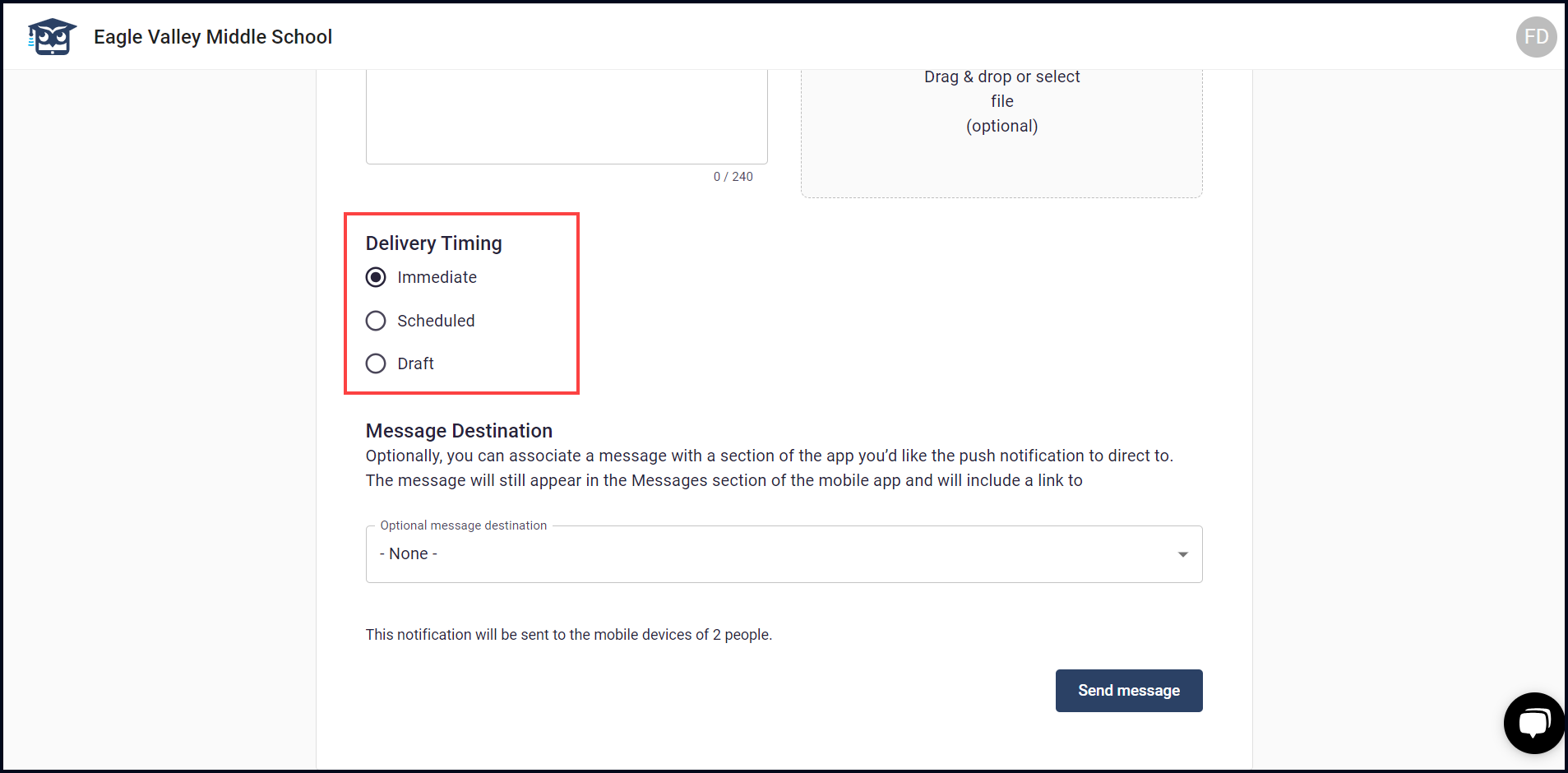 7. Use the radio buttons under Delivery Timing to select the delivery timing for your message.