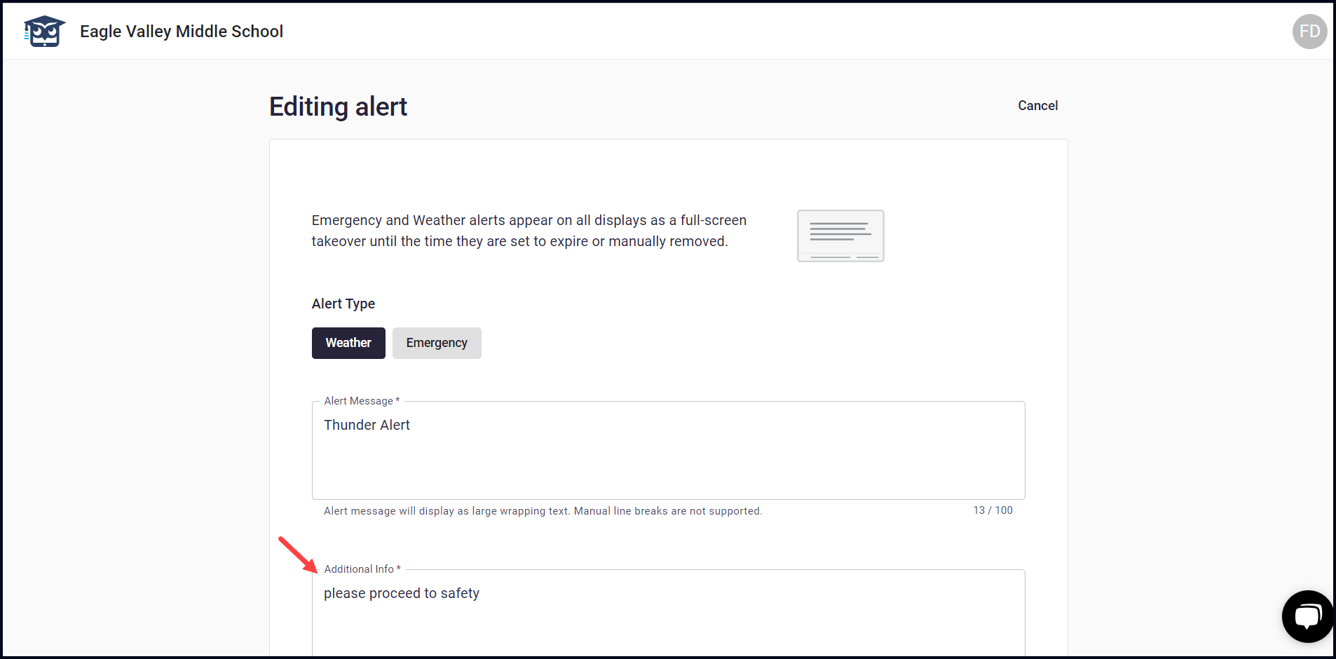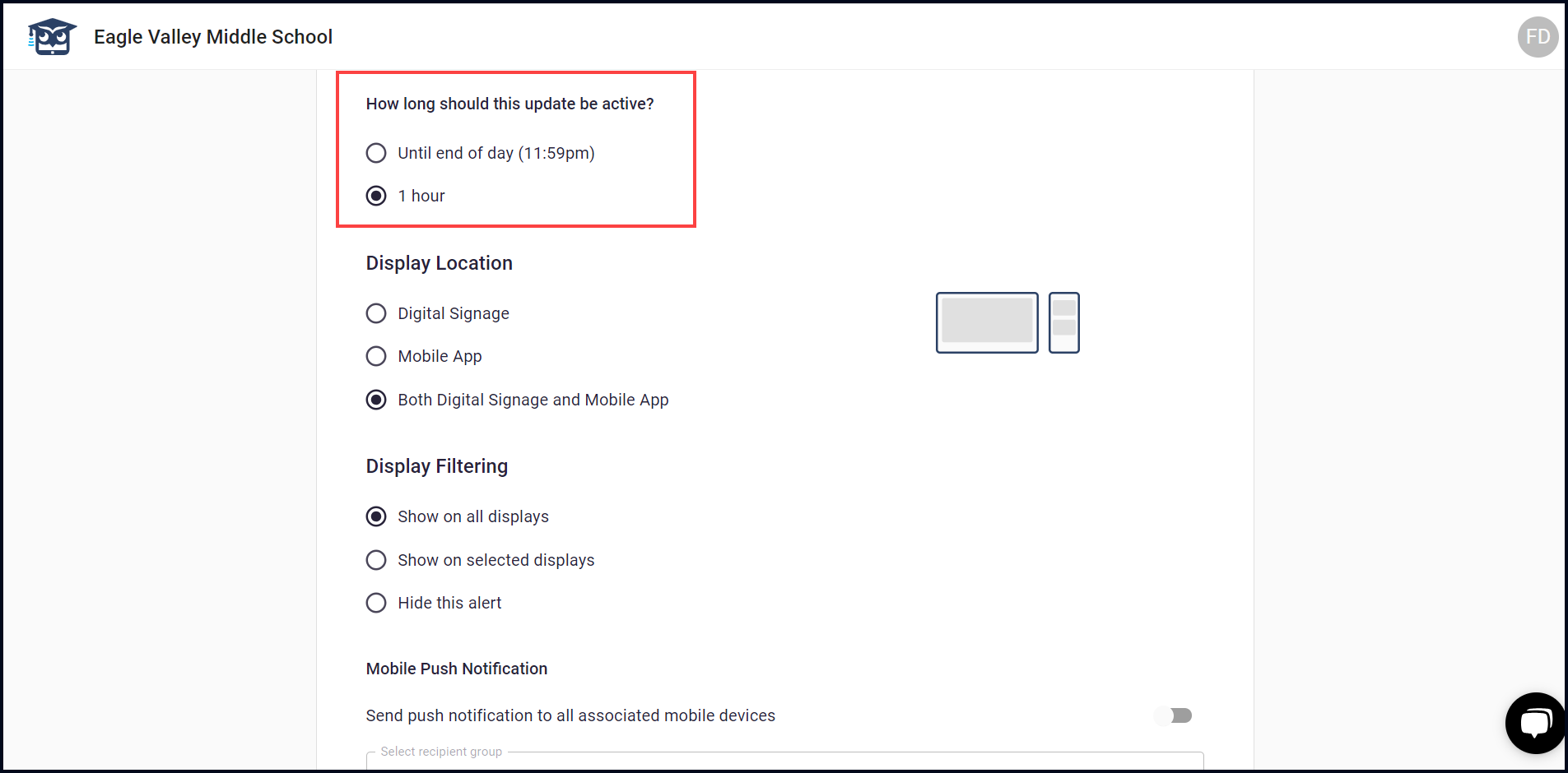 6. Choose the time period for which this alert will be active using the radio buttons displayed under the How long should this update be active? Heading.