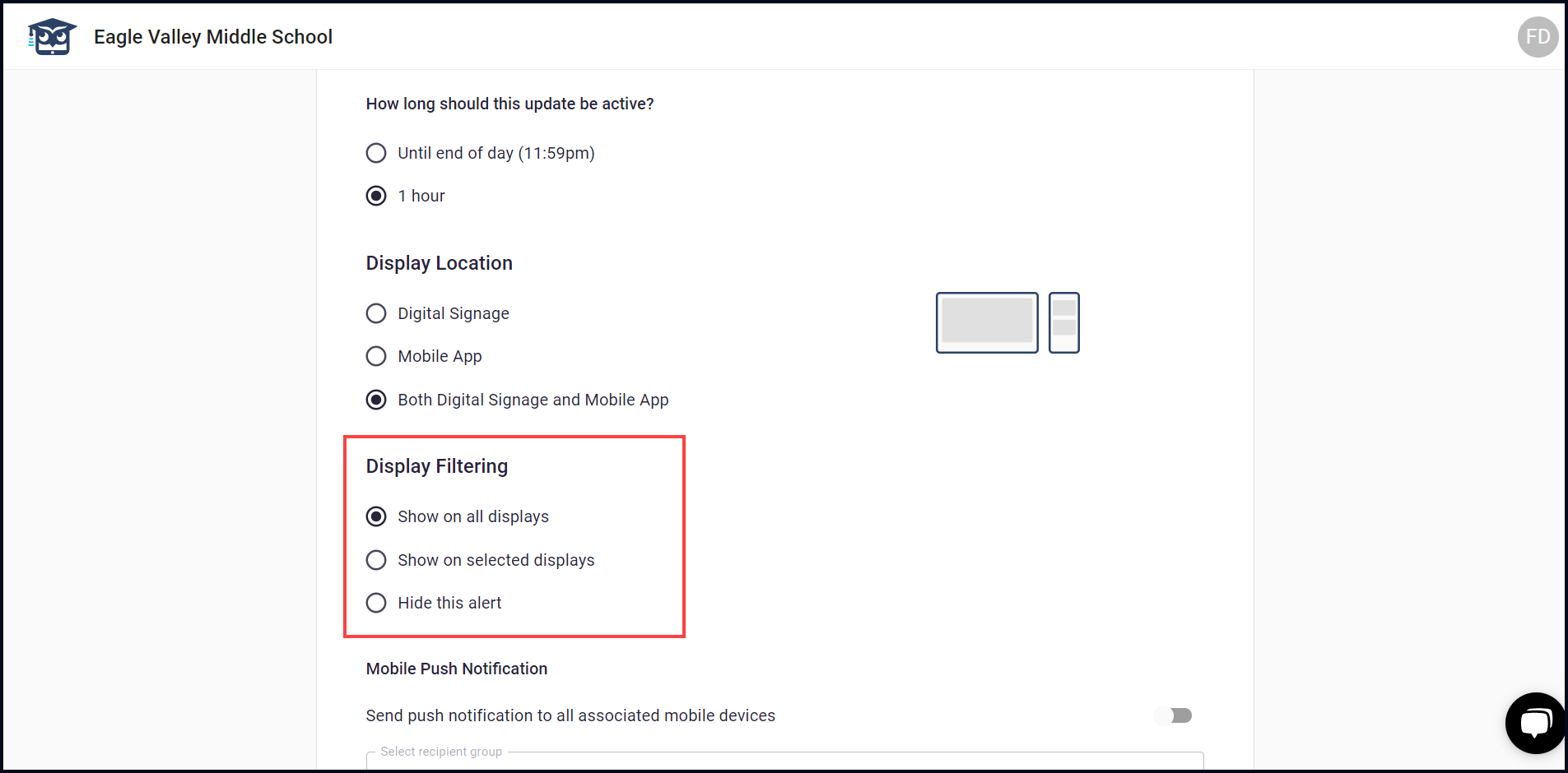 8. Choose the displays for this alert using the radio buttons under the Display Filtering heading.