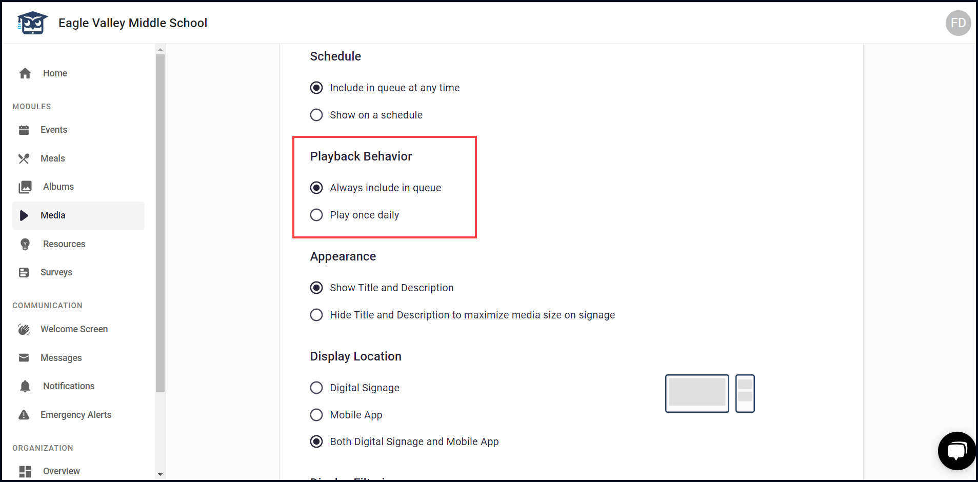 13. Use the options under Display Filtering to select the displays on which you want the media to appear.