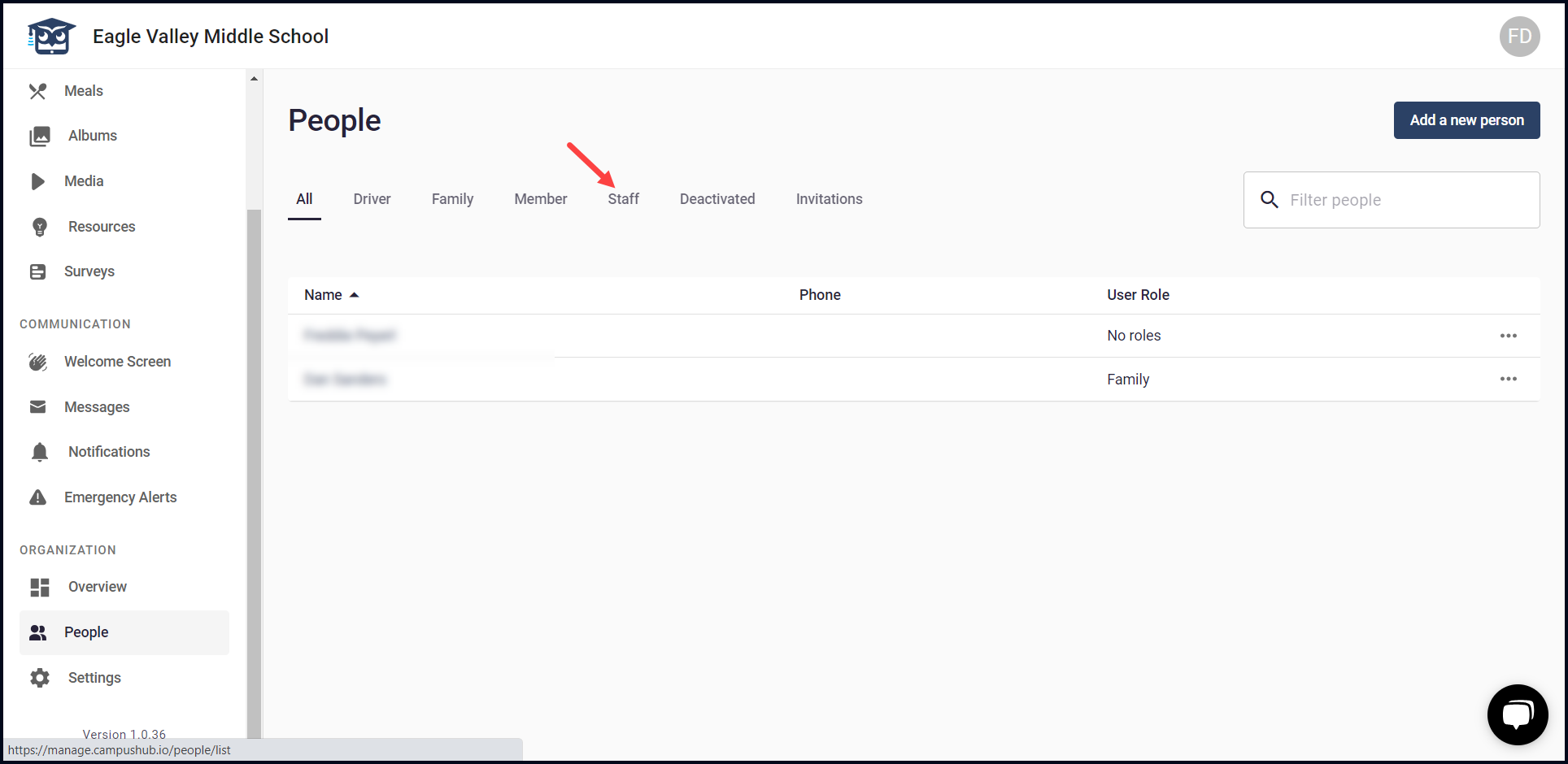 2. From the tabs displayed atop, select Staff. Doing so takes you to the Staff members list.