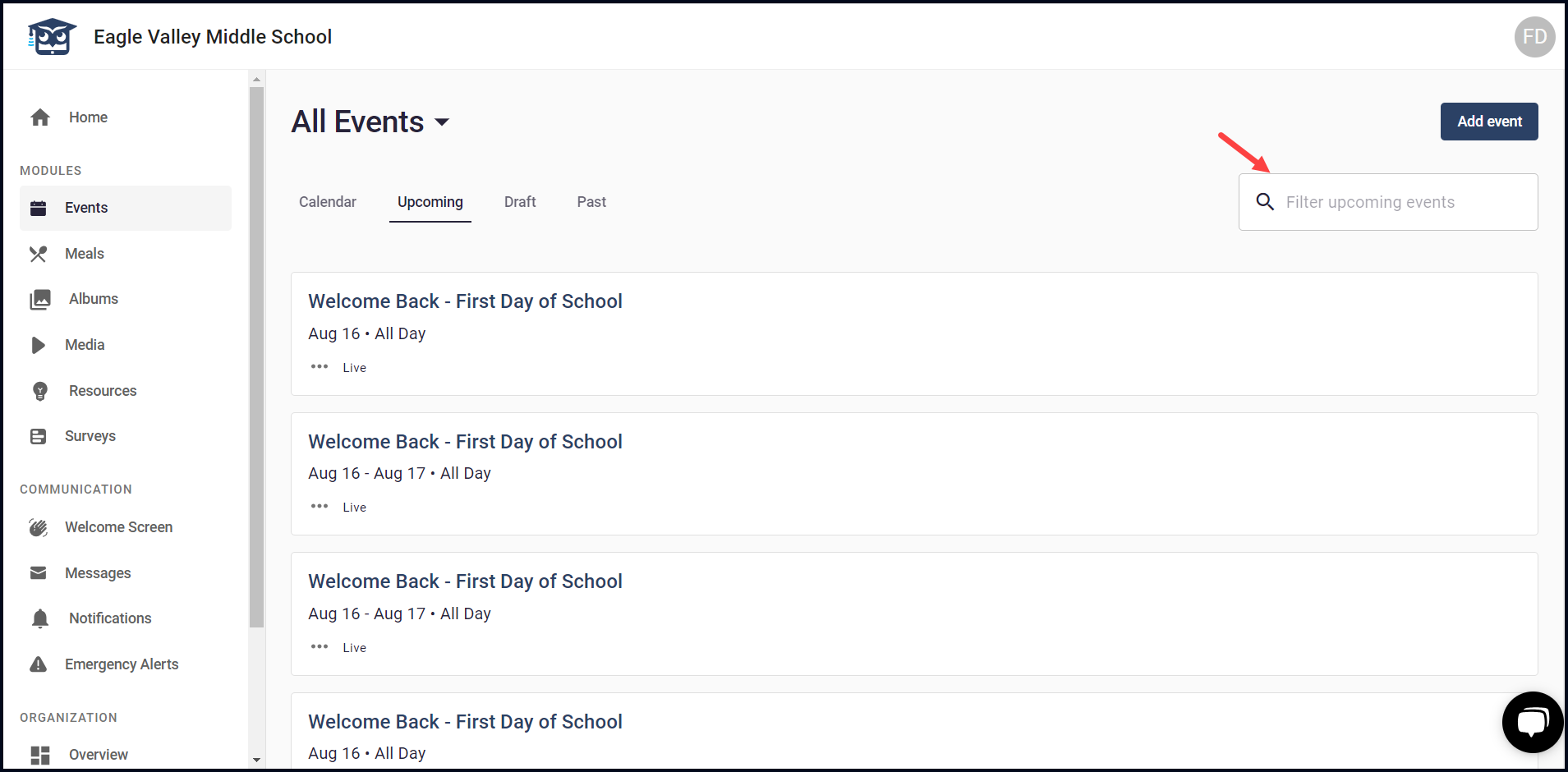3. To search for a specific upcoming event, type the name of the event in the Filter upcoming events field.